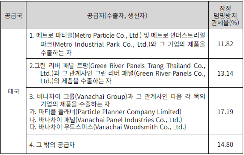 다. 잠정덤핑방지관세 부과대상 공급자 및 잠정덤핑방지관세율