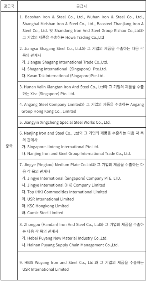 가.덤핑방지관세가 부과되는 물품은 중국산 탄소강 및 그 밖의 합금강 열간압연 후판 제품[철이나 비합금강 및 그 밖의 합금강의 평판압연제품(flat-rolled products of iron, non-alloy steel or other alloy steel)으로, 「관세법 시행령」 제98조제1항에 따른 관세ㆍ통계통합품목분류표의 품목번호 제7208.51.1000호, 제7208.51.9000호, 제7208.52.1000호, 제7208.52.9000호, 제7225.40.9010호, 제7225.40.9091호 또는 제7225.40.9099호에 해당하는 것을 말한다] 중 두께가 4.75밀리미터(㎜) 이상이고 폭이 600밀리미터 이상이며, 코일모양이 아니고, 냉간 압연을 하지 않은 것으로 한정하되, 다음의 물품에 대해서는 부과를 제외함.