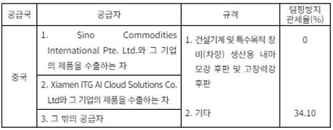 다.덤핑방지관세율은 34.10%로 함[단, 건설기계 및 특수목적 장비(차량) 생산용 내마모강 후판 및 고장력강 후판에 대해서는 0%]