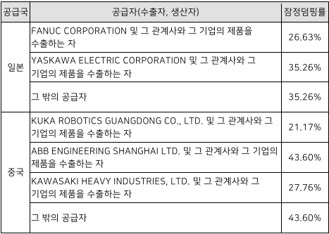 ㅇ 별도로 1개 이상의 부가축(기본축 이외 추가로 부착되는 장치)을 추가로 설치한 로봇과 완성품으로 수입되지 아니하고 기계장치(로봇본체), 제어장치, 전원케이블 및 조정기가 조립되지 않은 상태로 수입되는 경우도 조사대상 물품에 포함